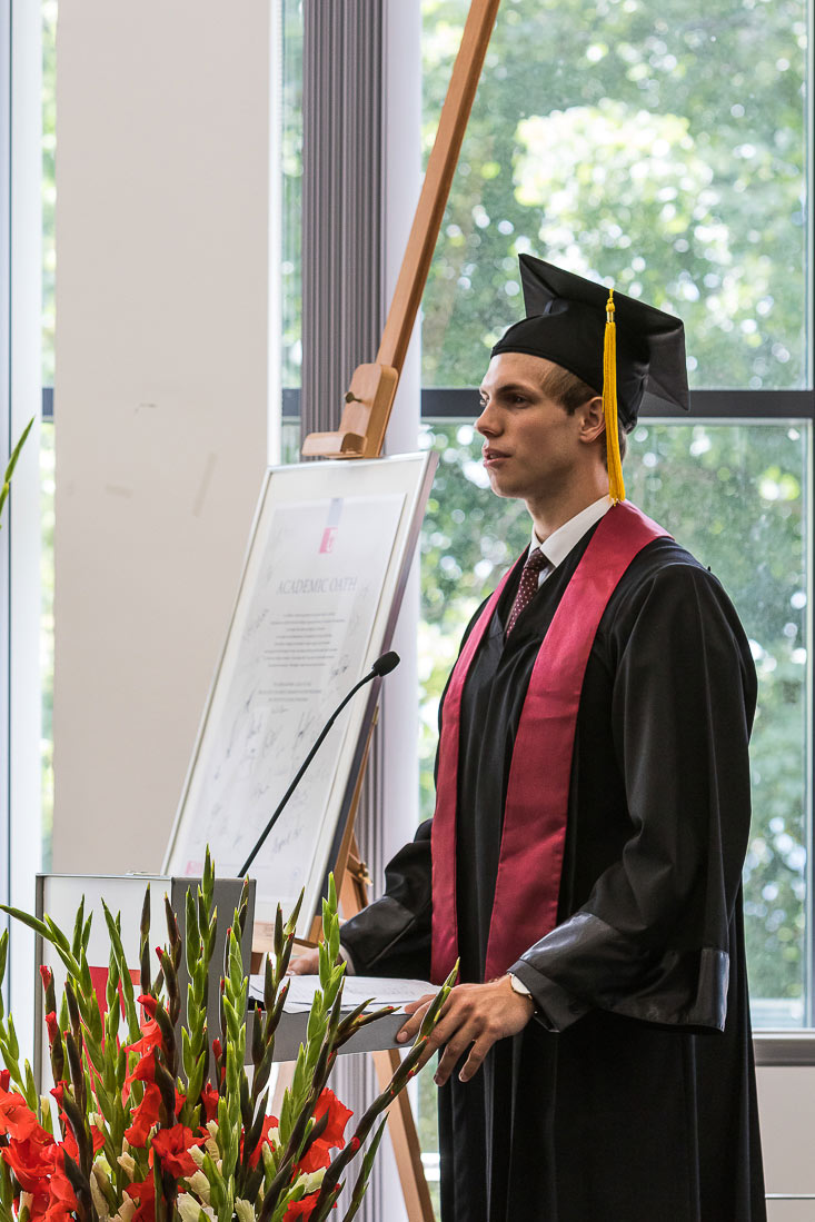 Auf Einladung der MU nahm Rena Romm, als Vertreterin des MHFF an der Feierlichkeit teil, mit der ehrenvollen Aufgabe die Diplome zu überreichen. Umso erfreulicher, als sich insgesamt drei MHFF StudentInnen unter den AbsolventInnen befanden. Stephanie Joyce Orense, Victoria Felser und Thomas Jandejsek schlossen ihre Bachelorstudien erfolgreich ab. Letzterem - als erfolgreichstem Absolventen und Inhaber des diesjährigen Valedictorian-Titels der Universität kam die besondere Rolle zu, die Abschiedsrede vor dem Auditorium zu halten.